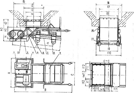 1、減速機 2、電動機 3、傳動平臺 4、聯(lián)軸器 5、H形架 6、連桿 7、給煤槽 8、閘門 9、機架 10、漏斗 11、托輥