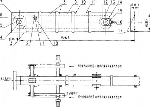 9、輸送鏈 10、中間節(jié)(非標(biāo)) 11、進料口 12、尾軸承箱 13、尾輪 14、尾軸 15、尾部