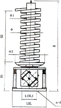 ZC系列垂直振動(dòng)輸送機(jī)的驅(qū)動(dòng)裝置振動(dòng)電機(jī)安裝在輸送塔下部,兩臺(tái)振動(dòng)電機(jī)對(duì)稱(chēng)交叉安裝,輸送塔由管體和焊接在管體周?chē)穆菪斔筒劢M成,輸送塔座于減振裝置上,減振裝置由底座和隔振彈簧組成。(見(jiàn)圖一)當(dāng)垂直輸送機(jī)工作時(shí),根據(jù)雙振動(dòng)電機(jī)自同步原理,由振動(dòng)電機(jī)產(chǎn)生激振力,強(qiáng)迫整個(gè)輸送塔體作水平圓運(yùn)動(dòng)和向上垂直運(yùn)動(dòng)的空間復(fù)合振動(dòng),螺旋槽內(nèi)的物料則受輸送槽的作用,作勻速拋擲圓運(yùn)動(dòng),沿輸送槽體向上運(yùn)動(dòng),從而完成物料的向上(或向下)輸送作業(yè)。